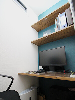 あとは書斎ですね!収納減らして作ったのですが、コロナが流行って、テレワークで使えたのが良かったです。クロスもこだわって主人の好みに。パソコン用に机に穴開けてもらいましたし、棚も作ってもらいました。今は子供も書斎で勉強したりしています。