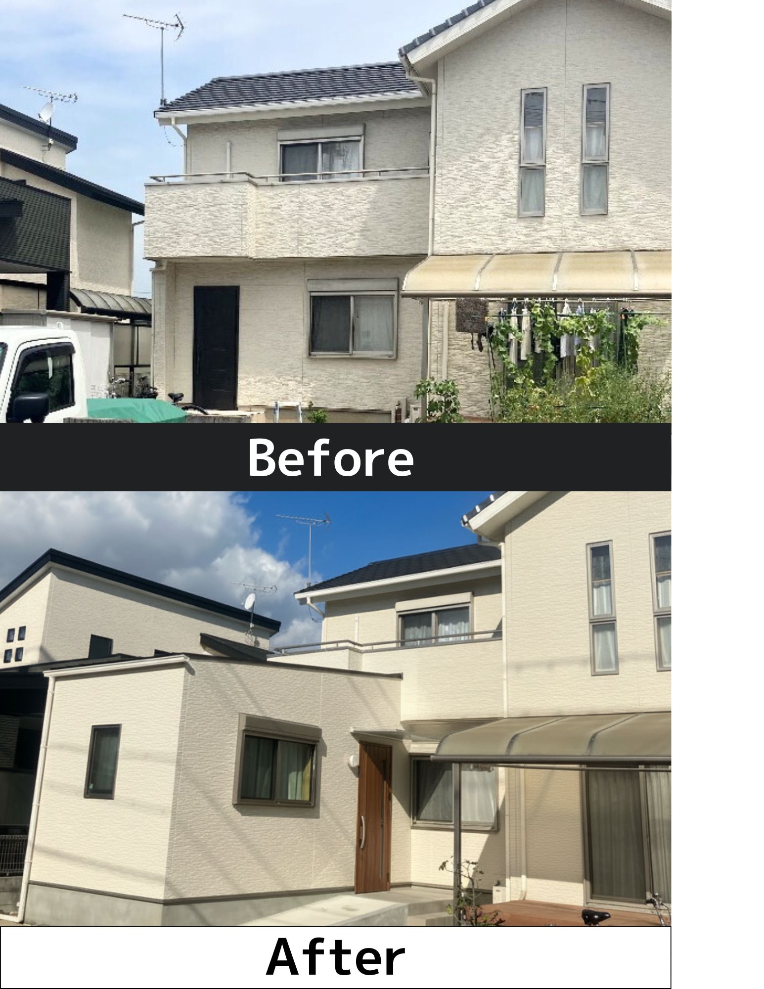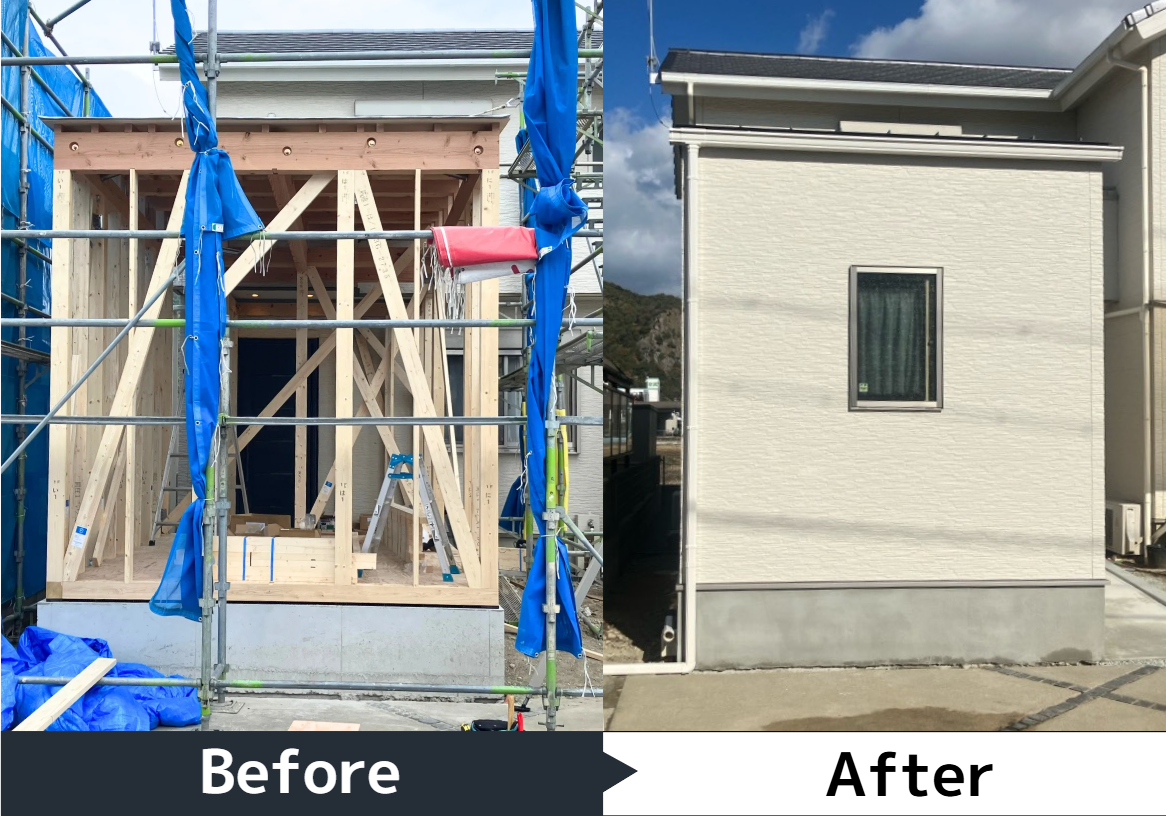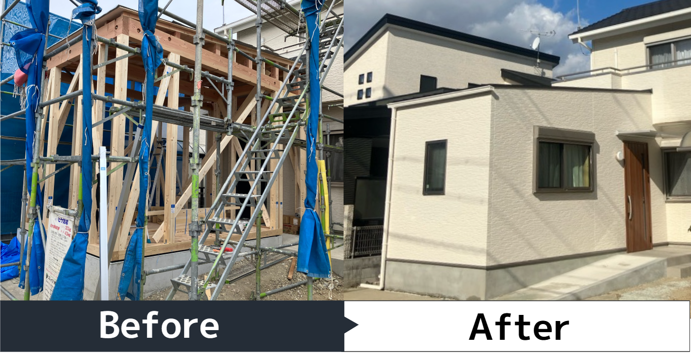 既存の玄関ドア部分と下駄箱を撤去・解体し、玄関ホールを3帖スペースに広くしました。増築部分の洋室は駐車場スペースを活用して6帖の広さを実現しました。玄関の位置も変更され、使いやすく開放感のある空間に。 -