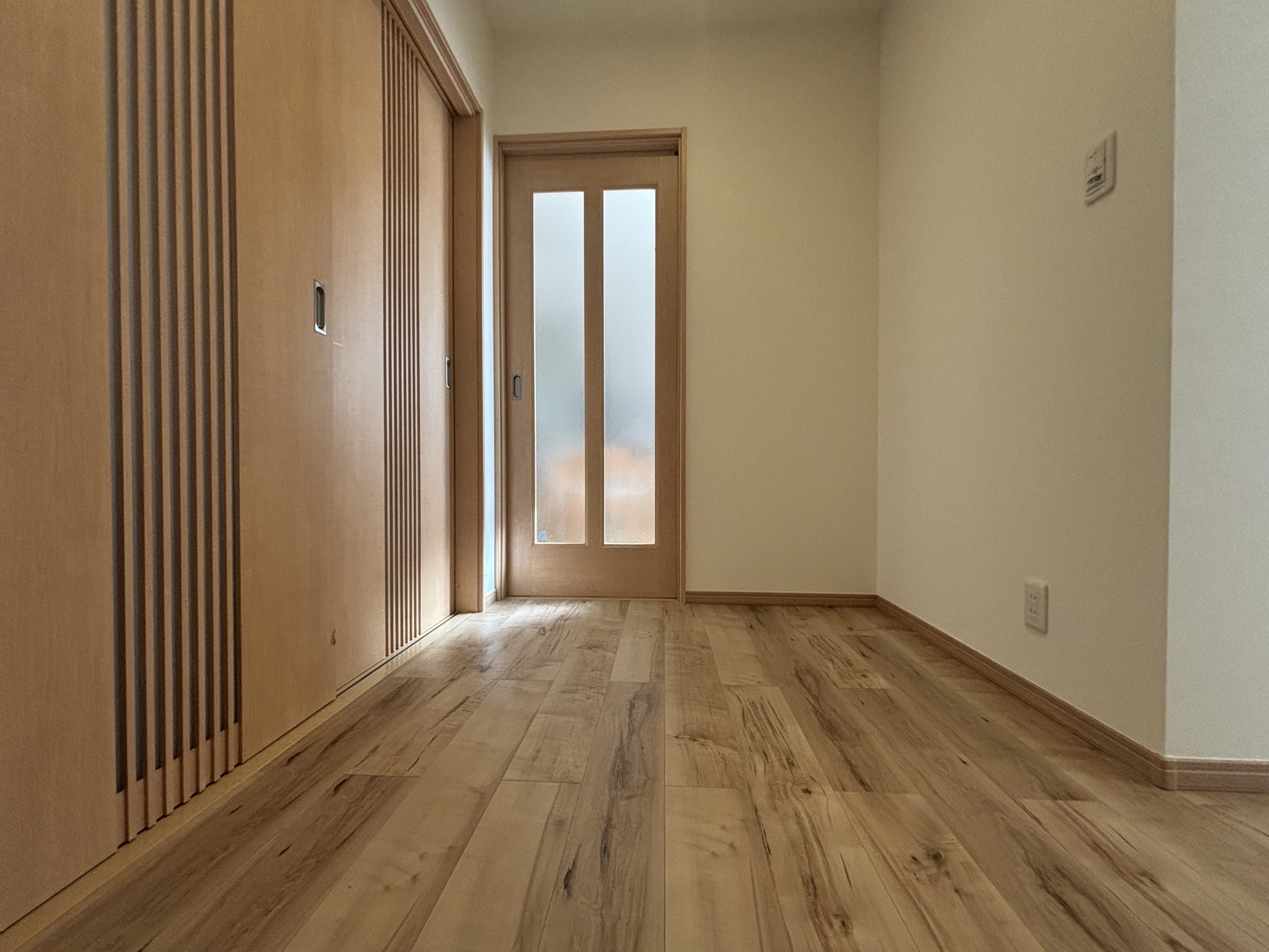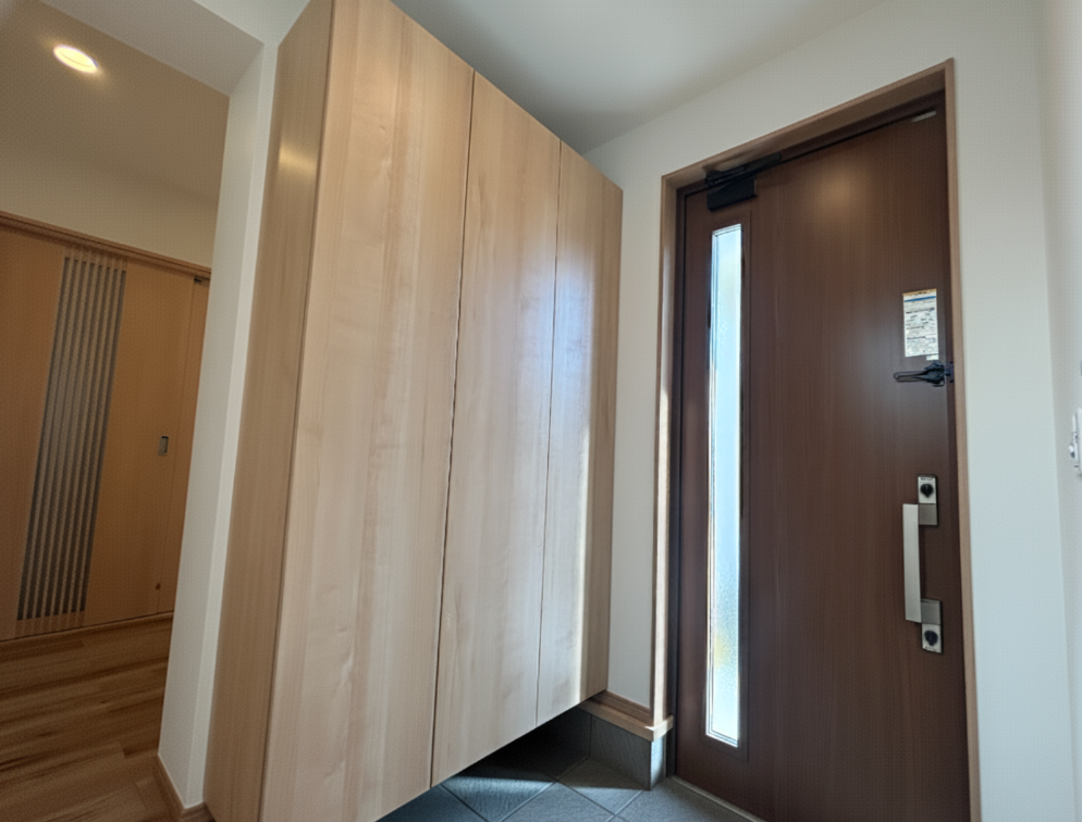 既存の玄関ドア部分と下駄箱を撤去・解体し、玄関ホールを3帖スペースに広くしました。増築部分の洋室は駐車場スペースを活用して6帖の広さを実現しました。玄関の位置も変更され、使いやすく開放感のある空間に。